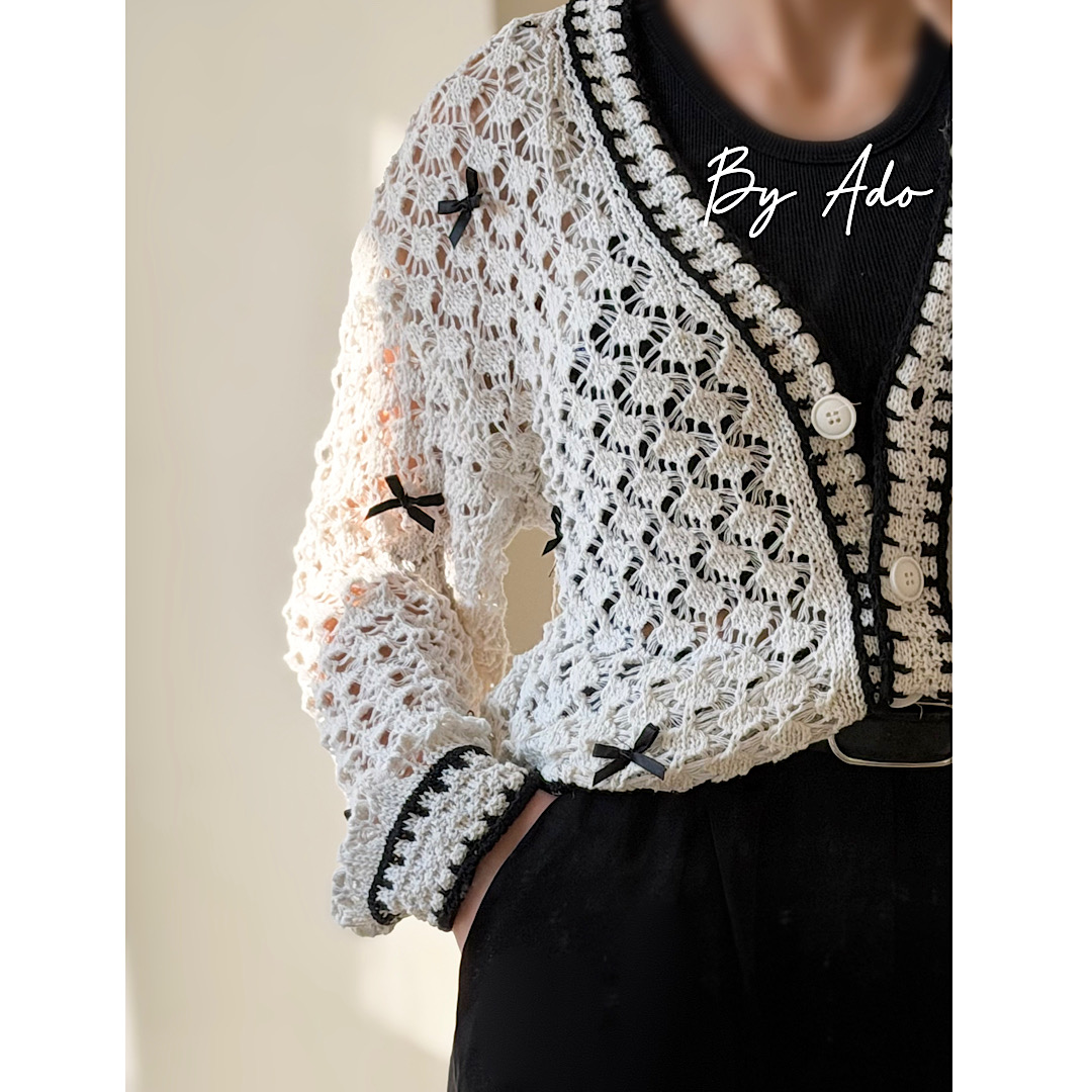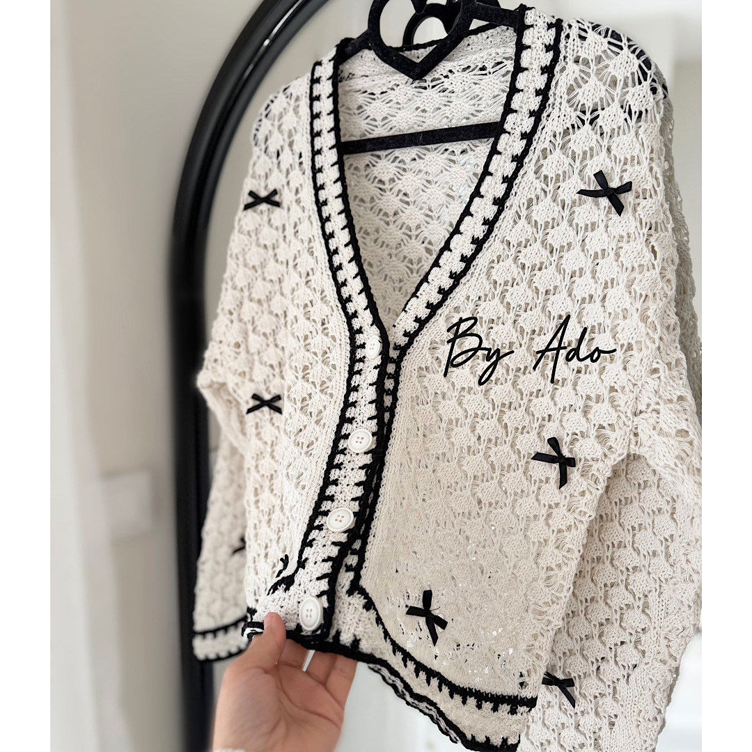 اين كارديگان جذاب قلاب بافي شده تك سايز هست روش پاپيوناي خيلي ناز داره دكمه هاش باز ميشه قدش حدودا ٥٠ سانته دور سينه اش تو حالت عادي ١٢٠ هست كه كشساني داره مناسبه سايز ٣٦ تا ٤٤