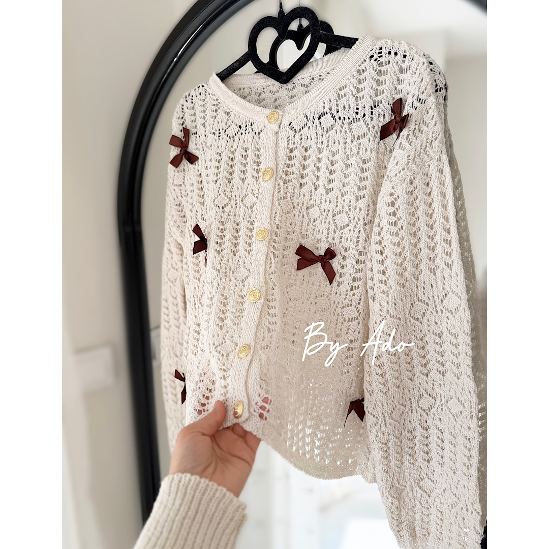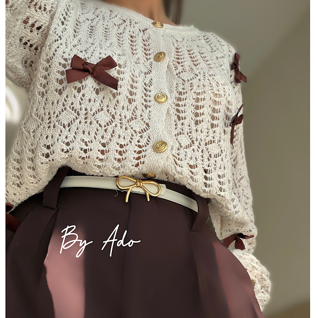 سلامليكم به آدو خوش اومدي ♥️🫶🏻 بريم سراغ اين بافت کاردیگان شيري رنگ با پاپیون قهوه ای كه اسمشو گذاشتم (تافی )خانوم 😍 تك سايز و تك رنگه در حالت بخار خورده دور سينه حدودا ١٢٠ و قدش حدودا ٥٢ هست